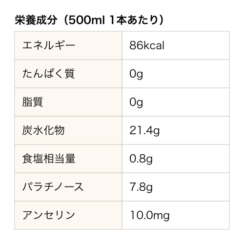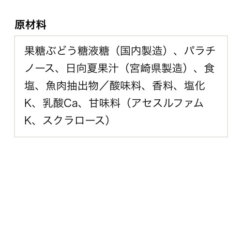 果糖ぶどう糖液糖(国内製造)、パラチノース、日向夏果汁(宮崎県製造)、食塩、魚肉抽出物/酸味料、香料、塩化K、乳酸Ca、甘味料(アセスルファムK、スクラロース)
