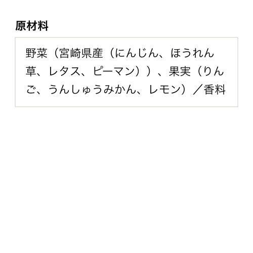 野菜(宮崎県産(にんじん、ほうれん草、レタス、ピーマン))、果実(りんご、うんしゅうみかん、レモン)/香料
