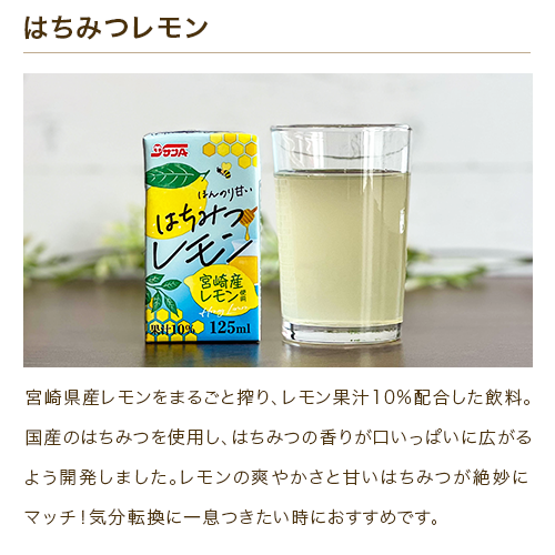 果汁シリーズの人気商品3種類と、新商品「はちみつレモン」を3本ずつ詰め合わせた12本セットです。